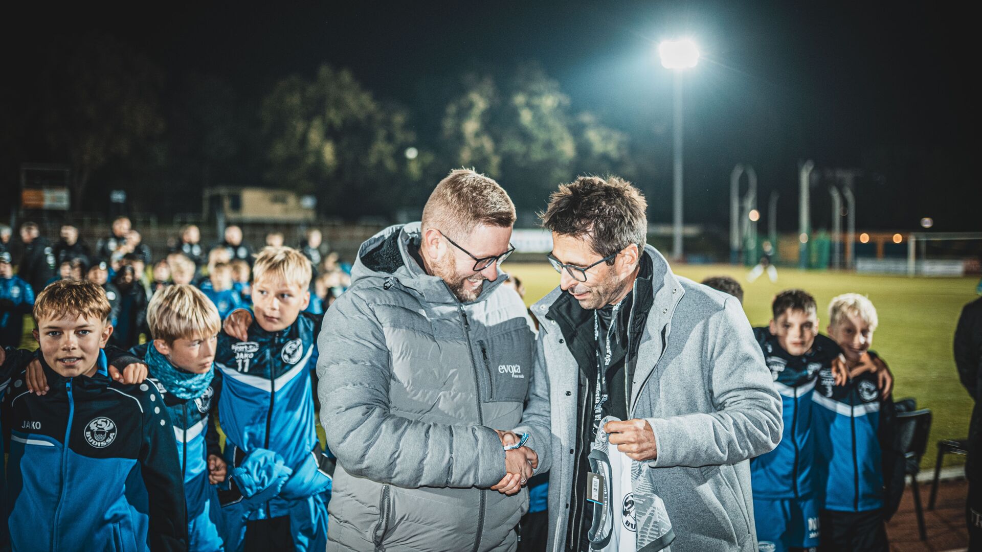 Am Donnerstag, 2. Oktober, durften sich die D2-Junioren über neue Trikots freuen. Übergeben wurden diese von der evoxa new media GmbH, vertreten durch Geschäftsführer Martin Gliemann, anlässlich des siegreichen Heimspiels der 1. Männermannschaft. Die feierliche Übergabe fand im Beisein zahlreicher Fans und Vereinsvertreter statt, die den erfolgreichen Spieltag gemeinsam feierten.